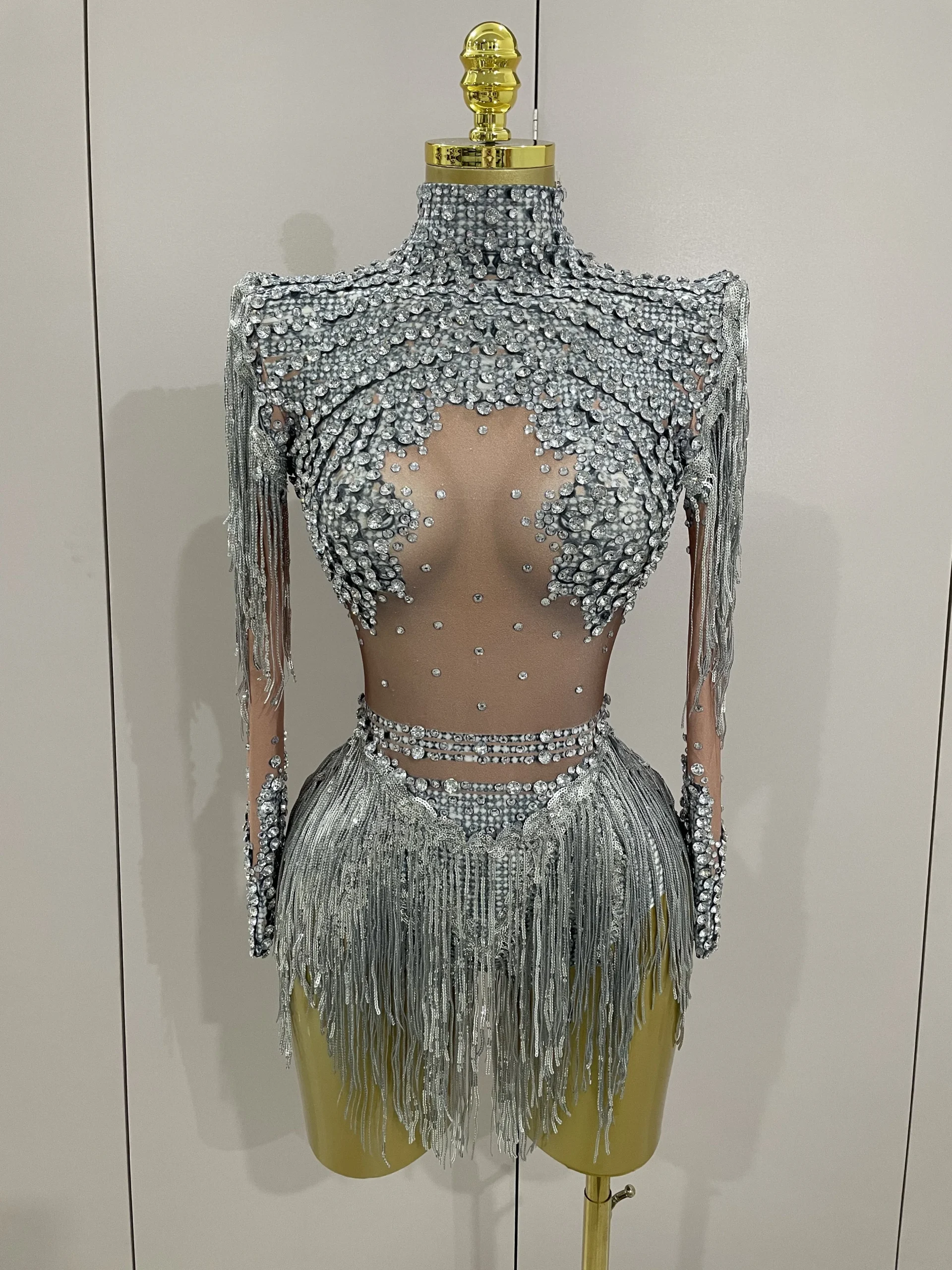 Body Elástico con Borlas y Lentejuelas Brillantes – Traje de Actuación para Baile Latino