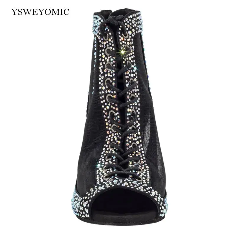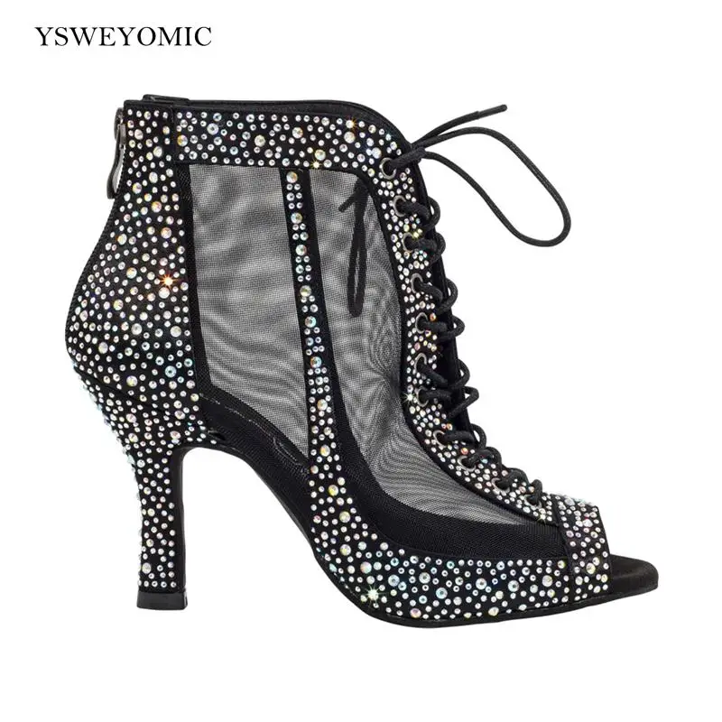 Bota de baile negra Tacón medio de satén y malla negra 7 cm 8 cm 9 cm Suela de cuero de ante interior Zapatos de baile de Salsa latina para equipo de baile