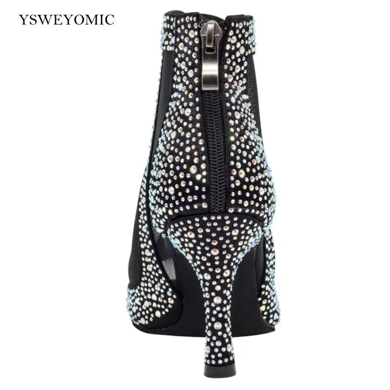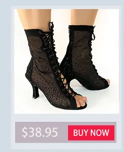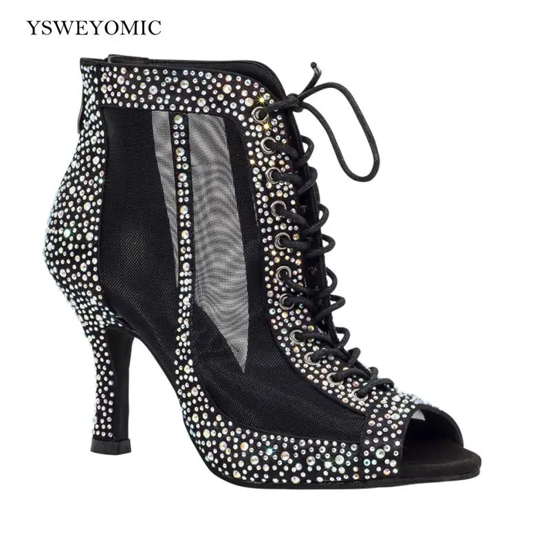Bota de baile negra Tacón medio de satén y malla negra 7 cm 8 cm 9 cm Suela de cuero de ante interior Zapatos de baile de Salsa latina para equipo de baile