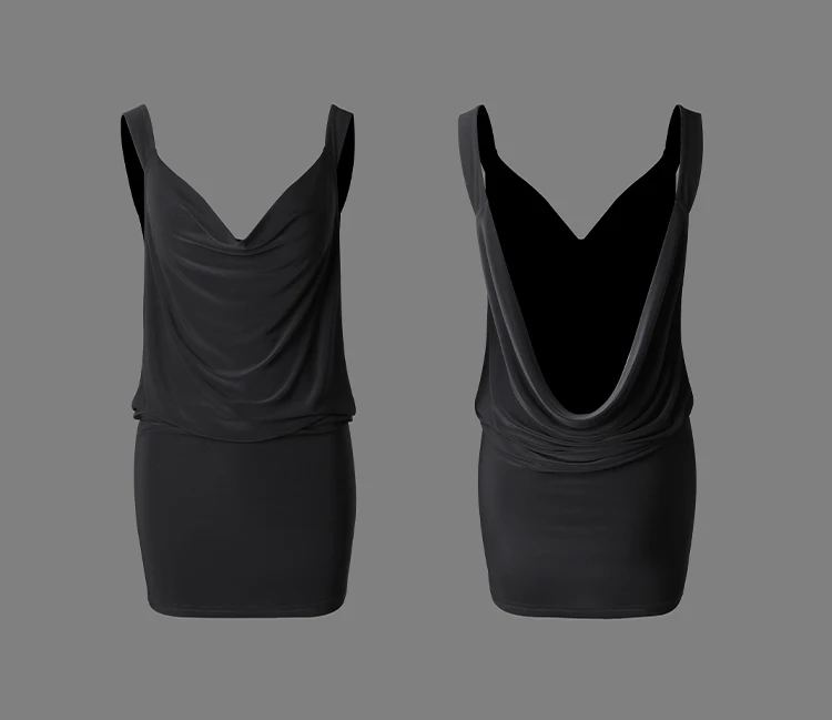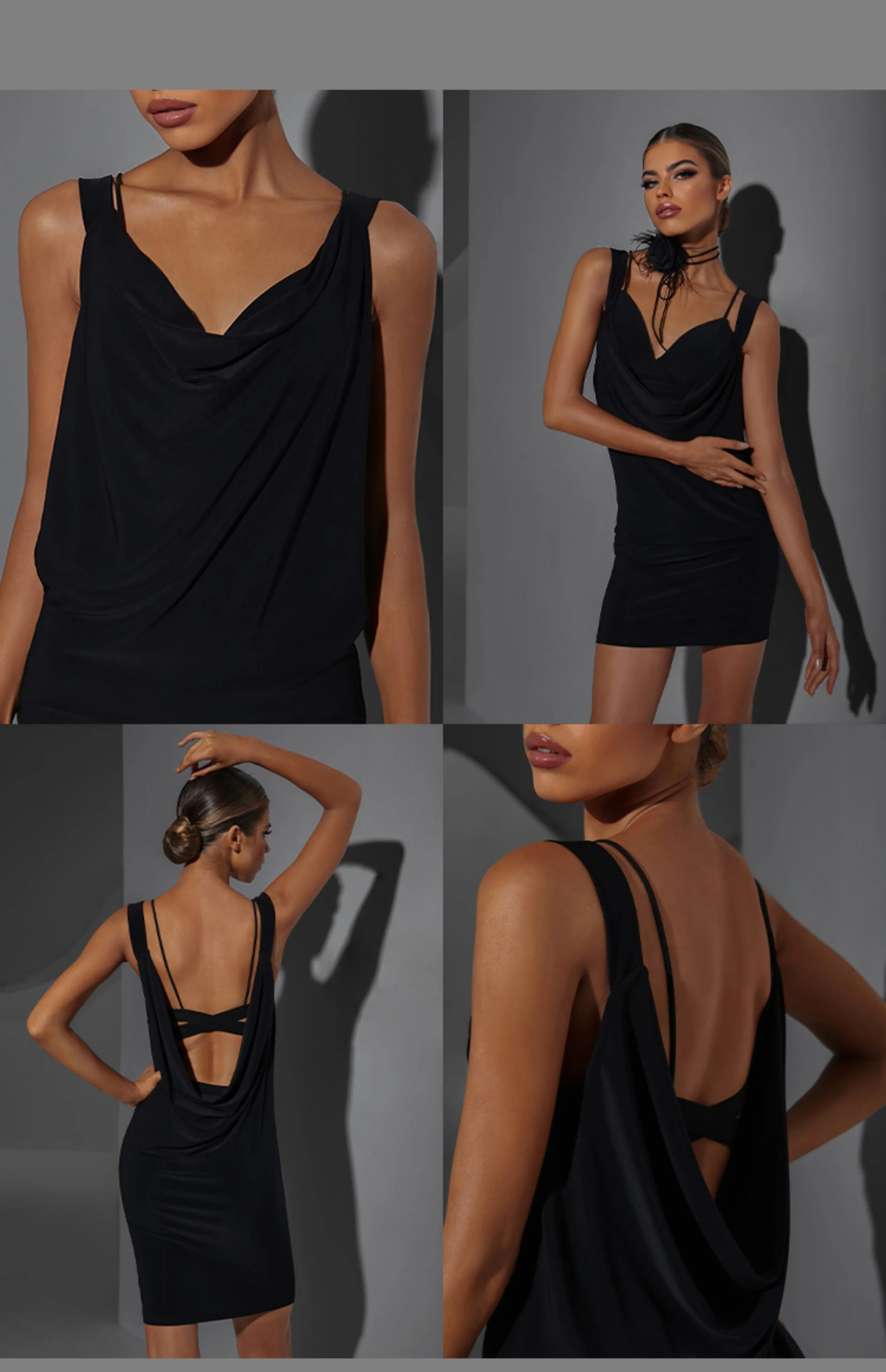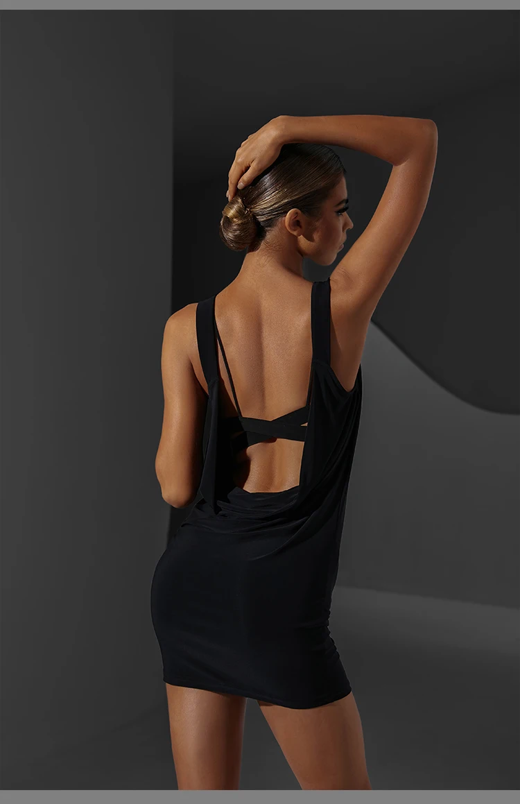 Este elegante vestido negro sin mangas es perfecto para la práctica y presentaciones de baile latino. Con un diseño clásico y sofisticado, proporciona comodidad y libertad de movimiento, permitiendo que te sientas segura y profesional en la pista de baile