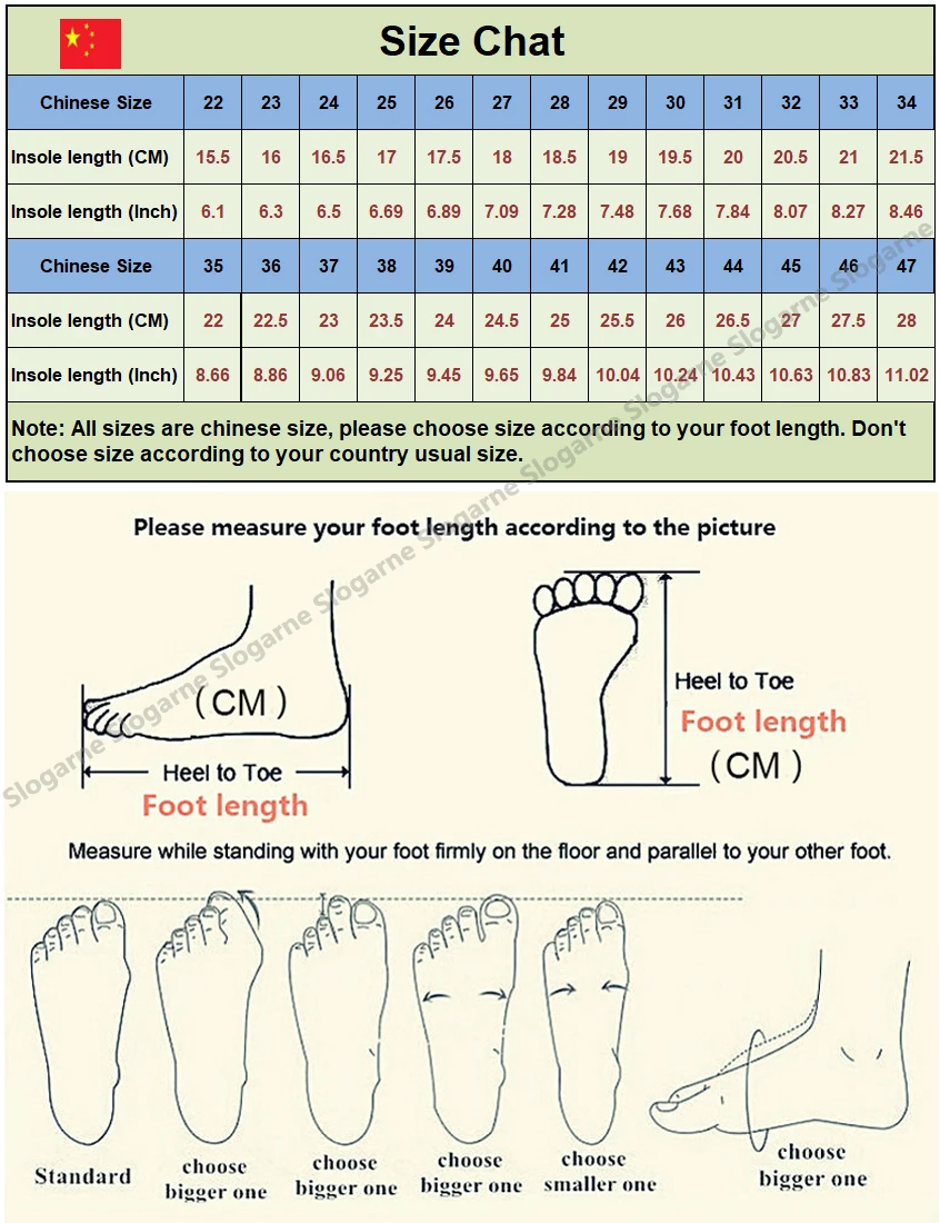 Nota:Todas las tallas son chinas, no europeas, elija la talla según la longitud de su pie, no elija la talla según la talla habitual de su país;Es mejor elegir una talla más grande si tu pie es un poco ancho o tu empeine es un poco alto;Estudie nuestro chat de tallas antes de realizar pedidos, ¡gracias!